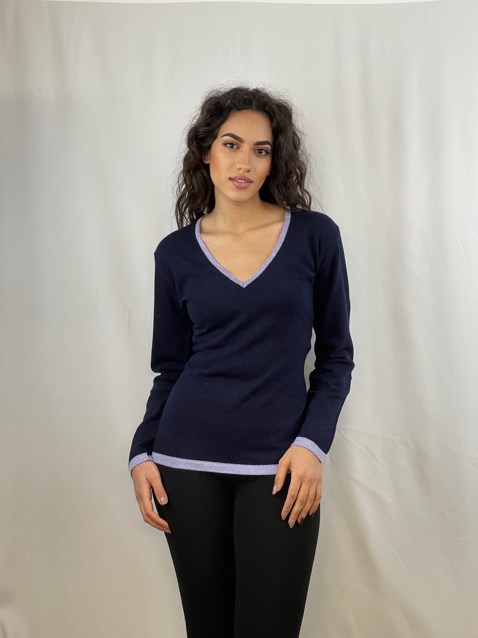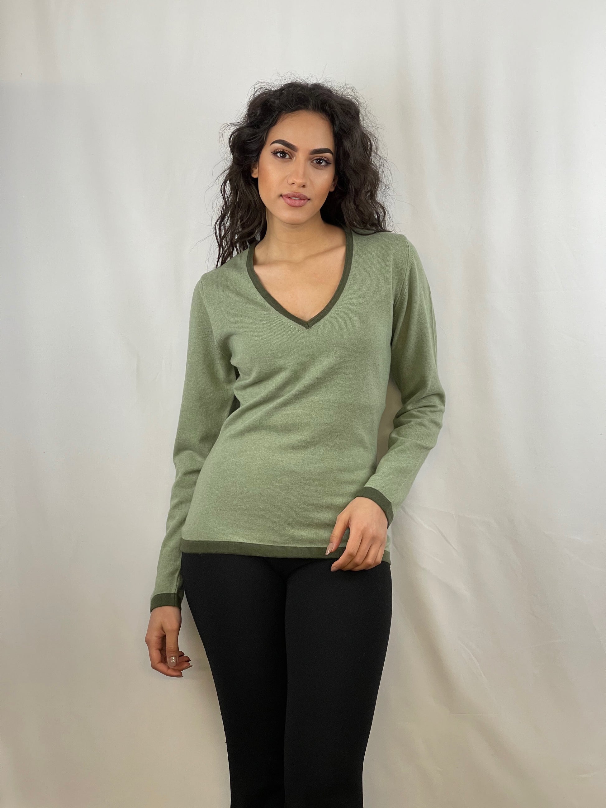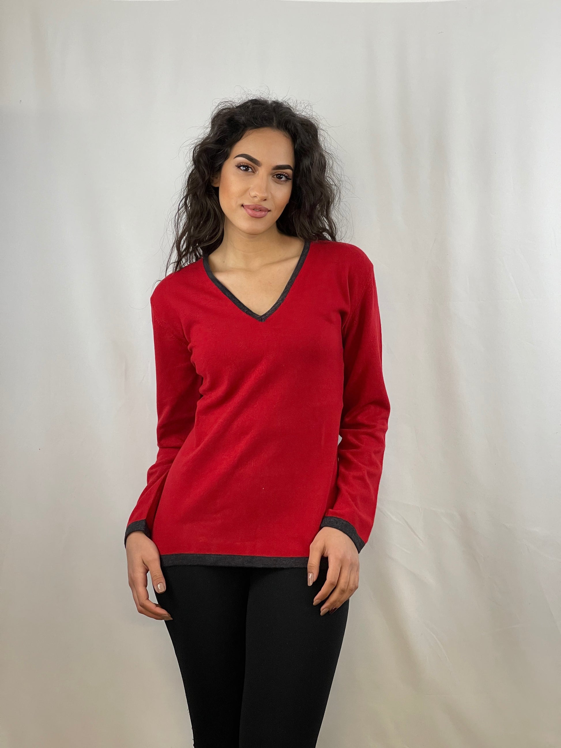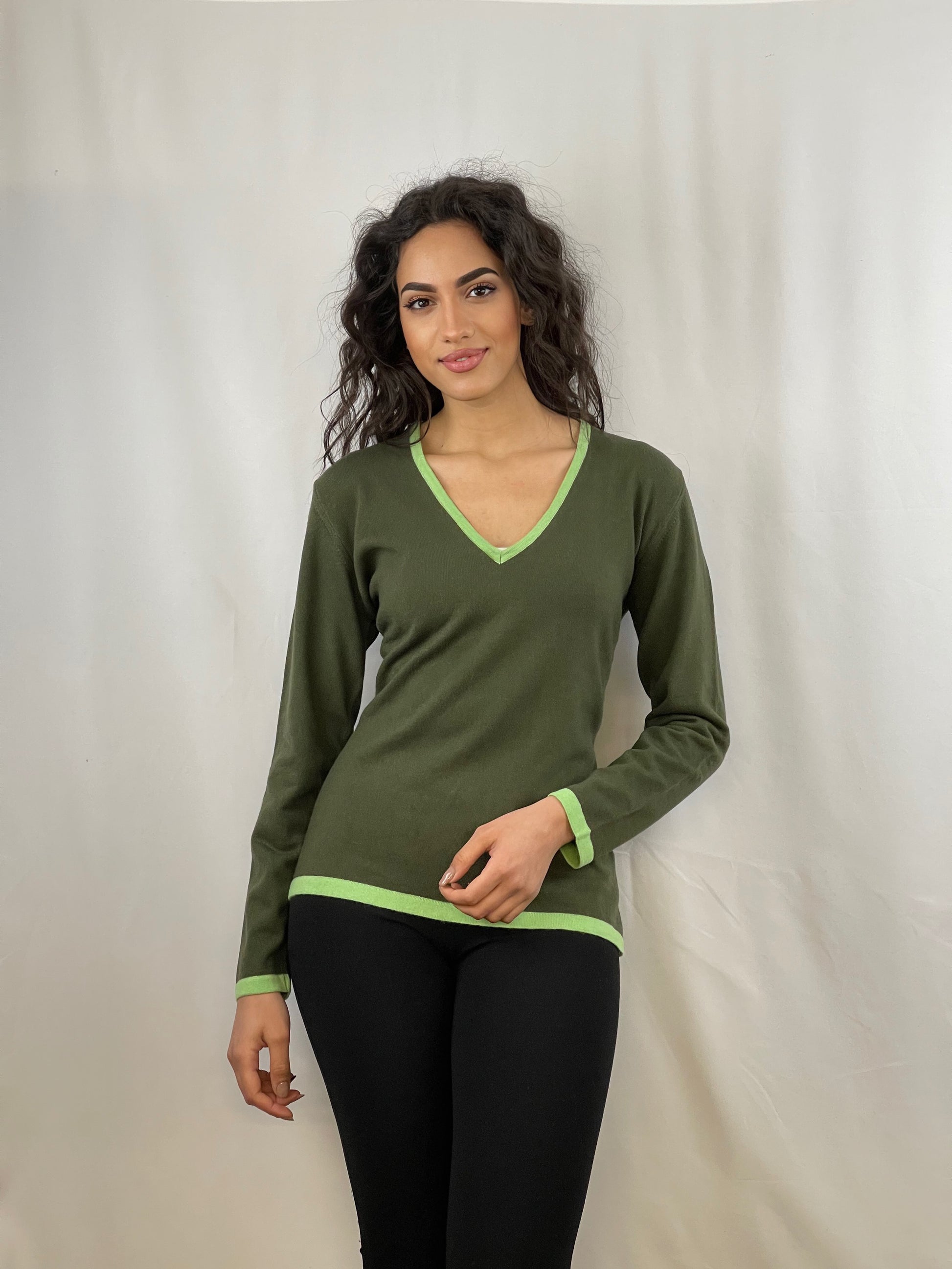 This women's V-neck sweater offers a stylish and fashionable look thanks to the eye-catching color combination on the collar, cuffs and hem. The slim fit gives a slim and feminine silhouette, perfect for any occasion. Crafted from high-quality materials, this sweater is a must-have for every wardrobe.
