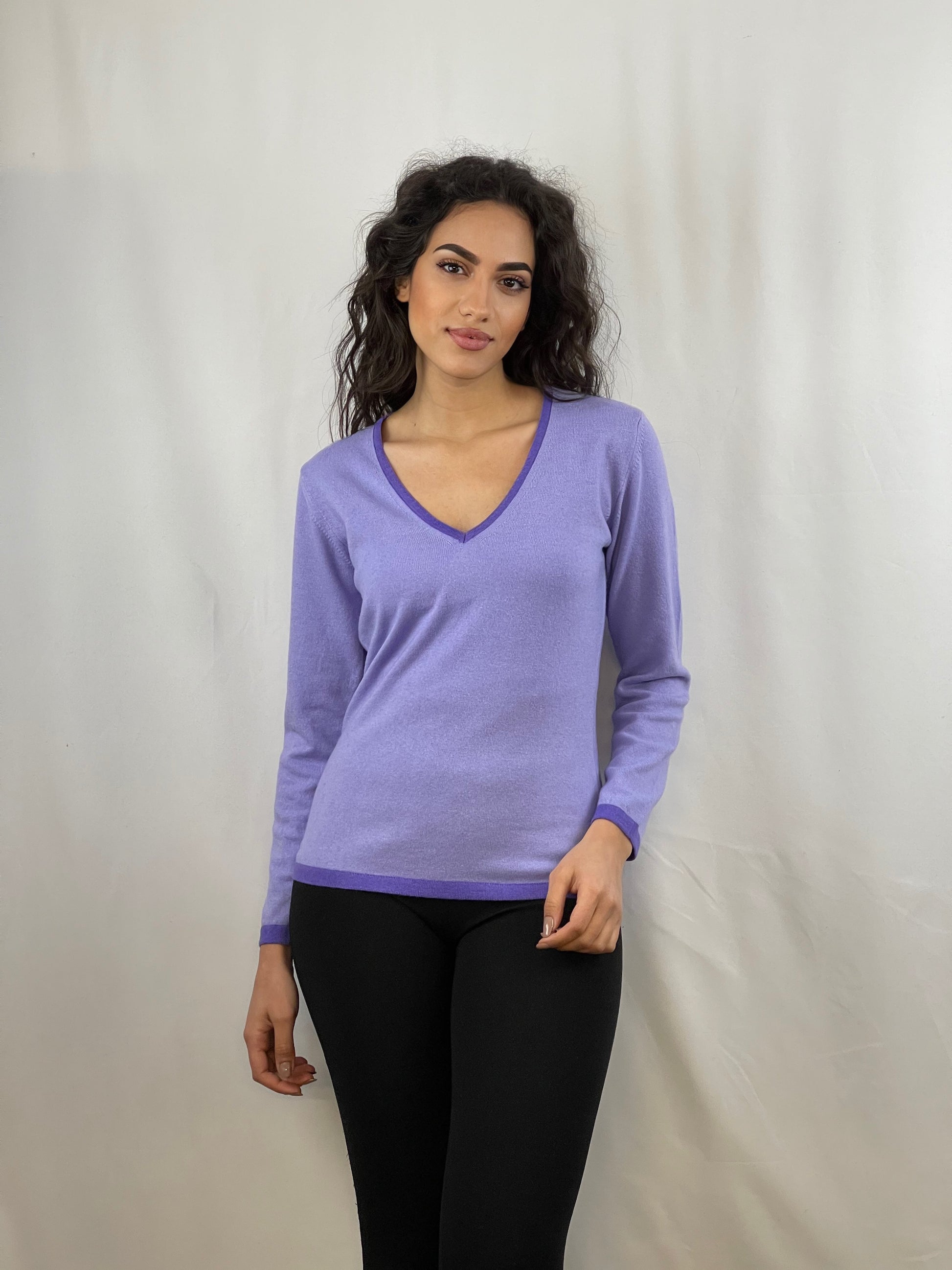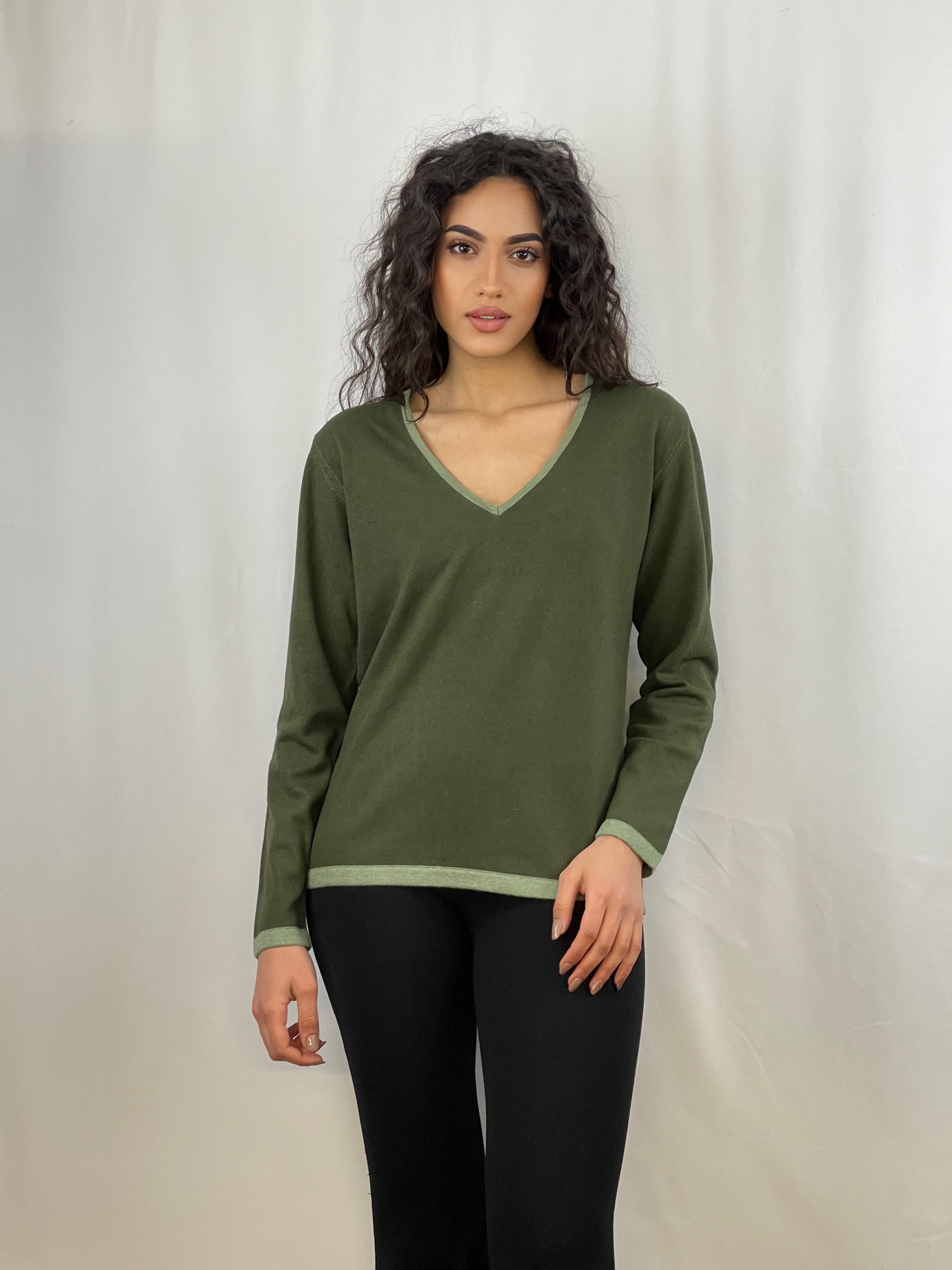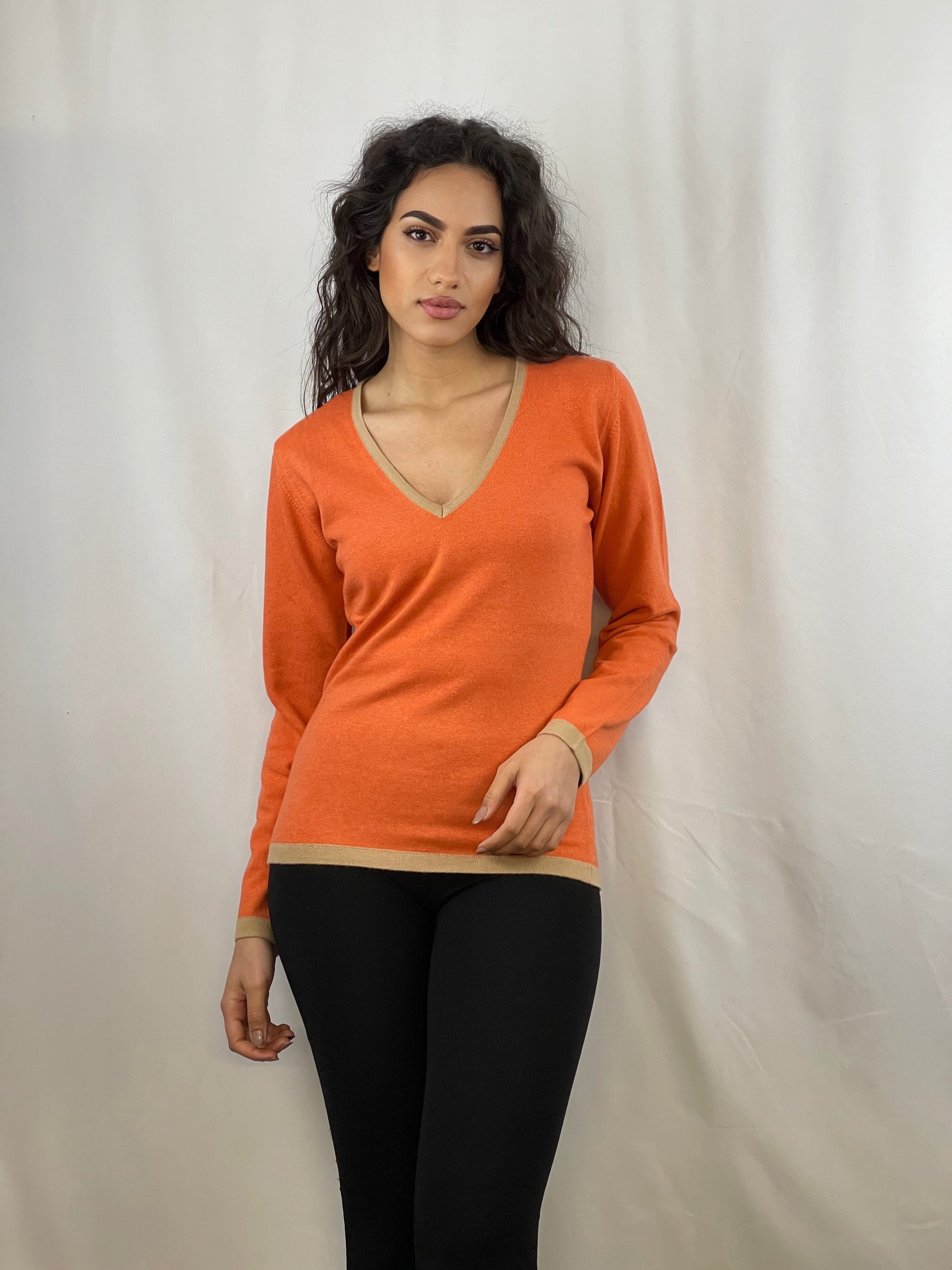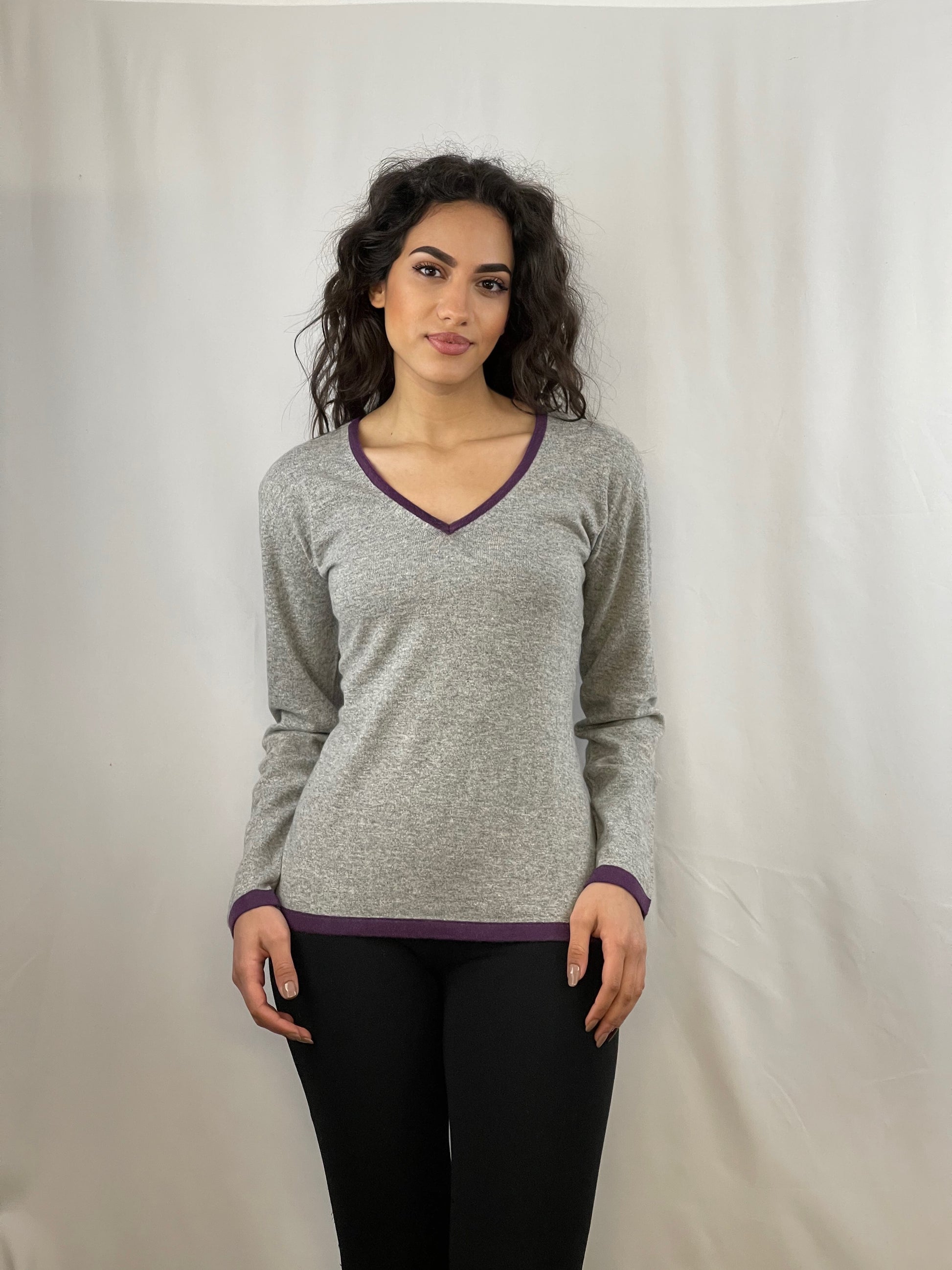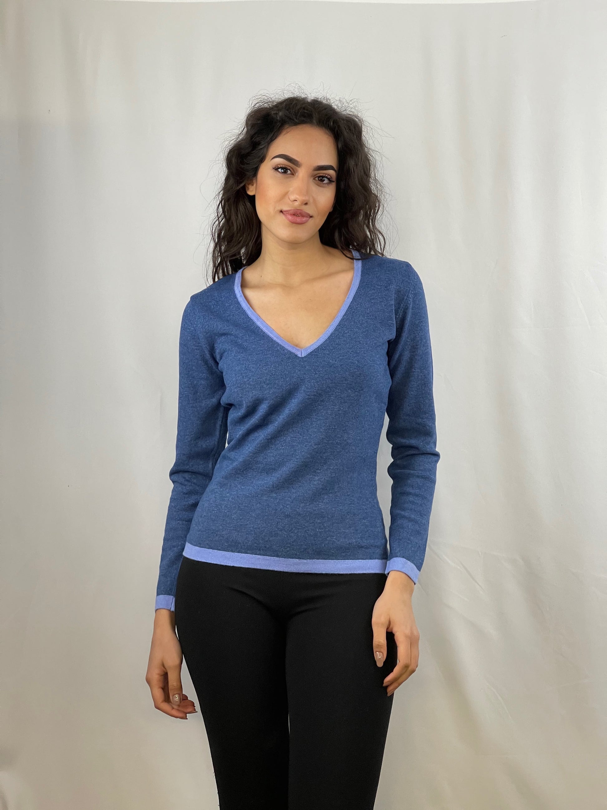 This women's V-neck sweater offers a stylish and fashionable look thanks to the eye-catching color combination on the collar, cuffs and hem. The slim fit gives a slim and feminine silhouette, perfect for any occasion. Crafted from high-quality materials, this sweater is a must-have for every wardrobe.