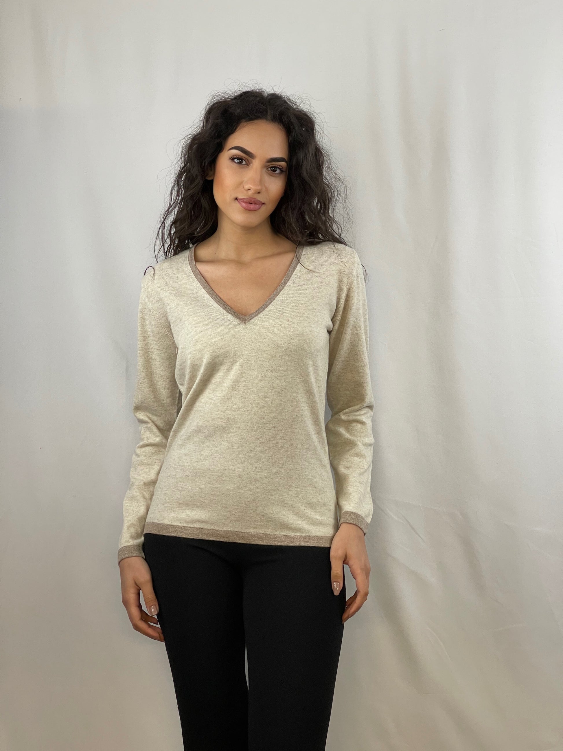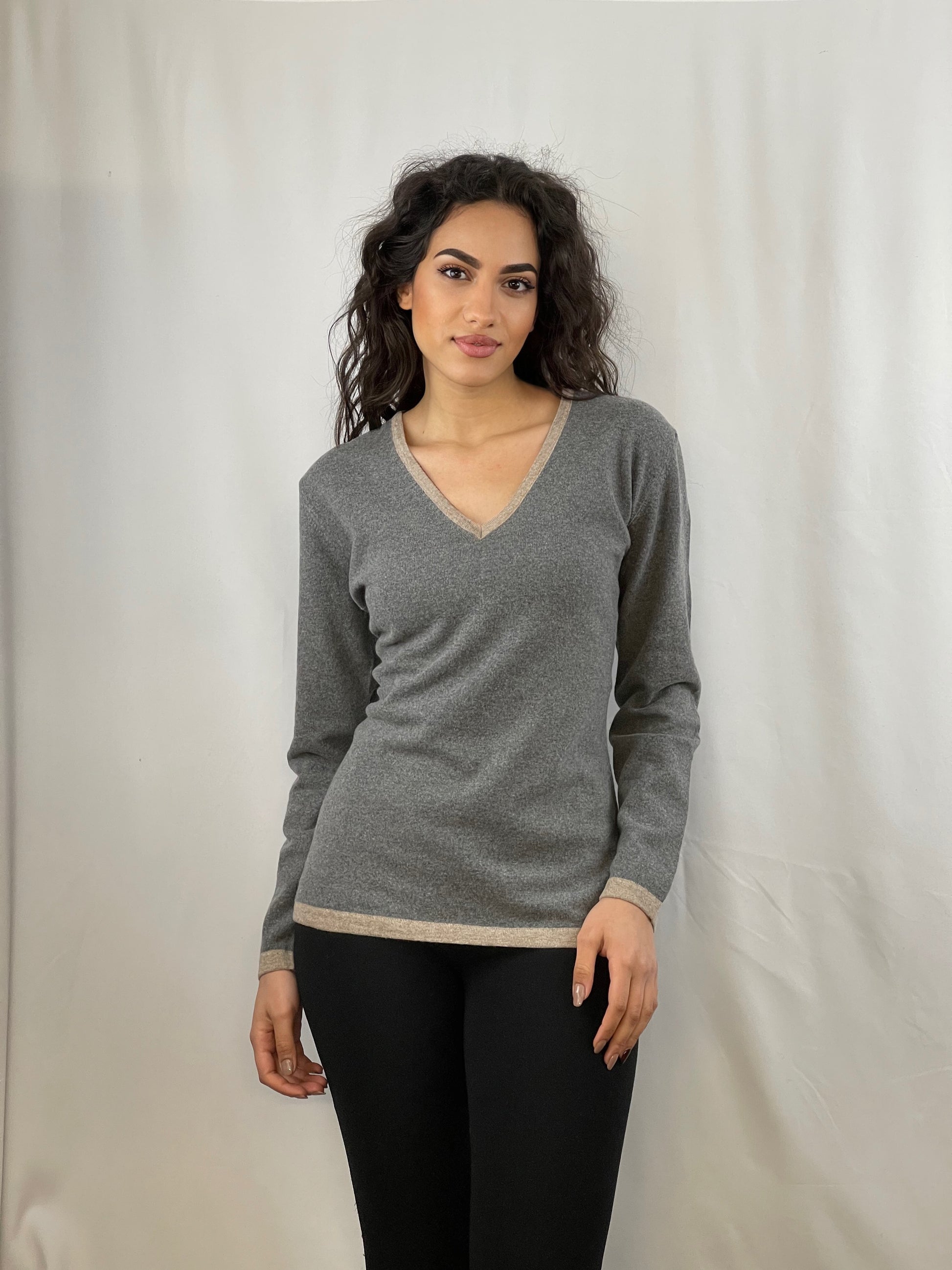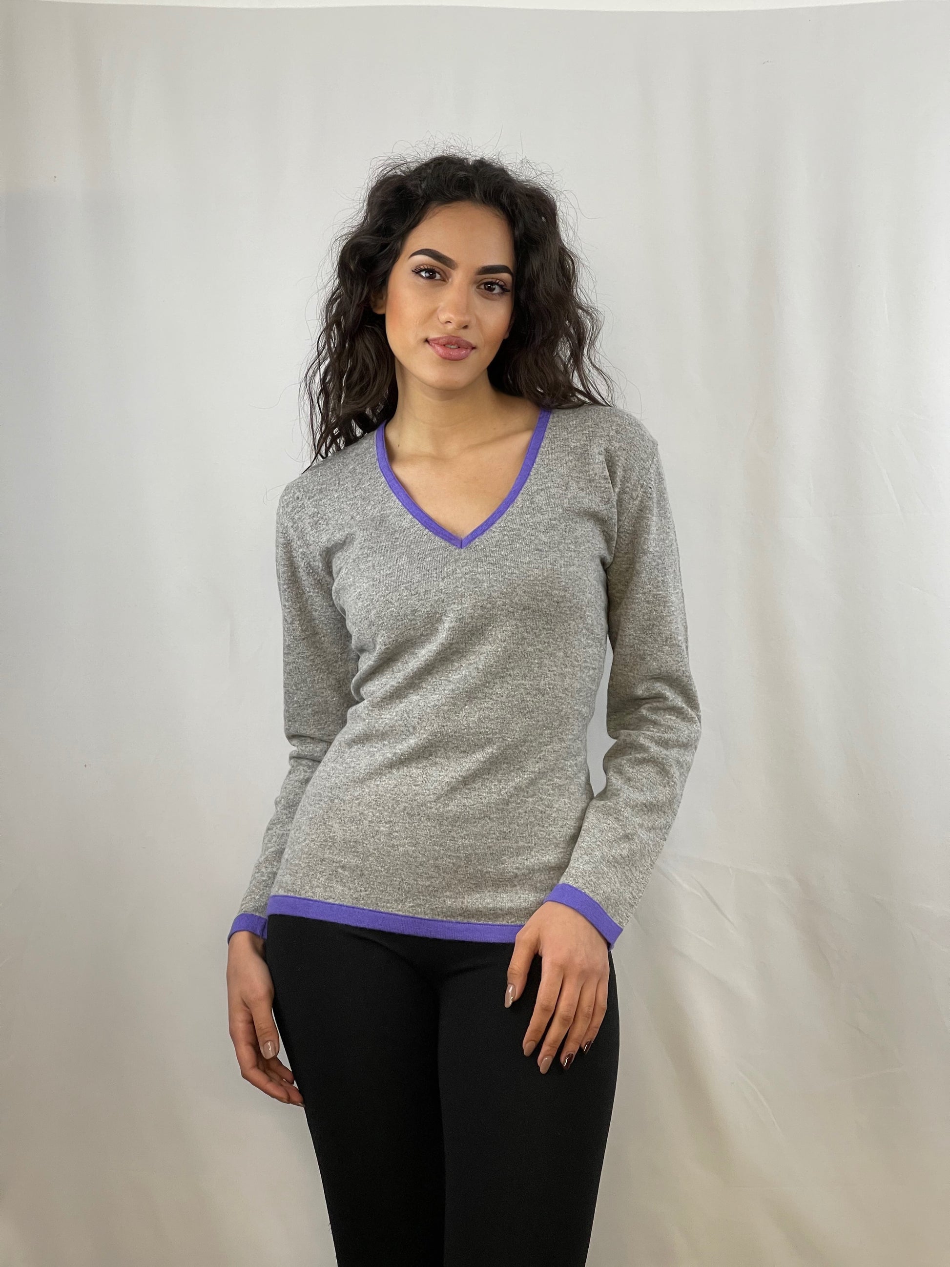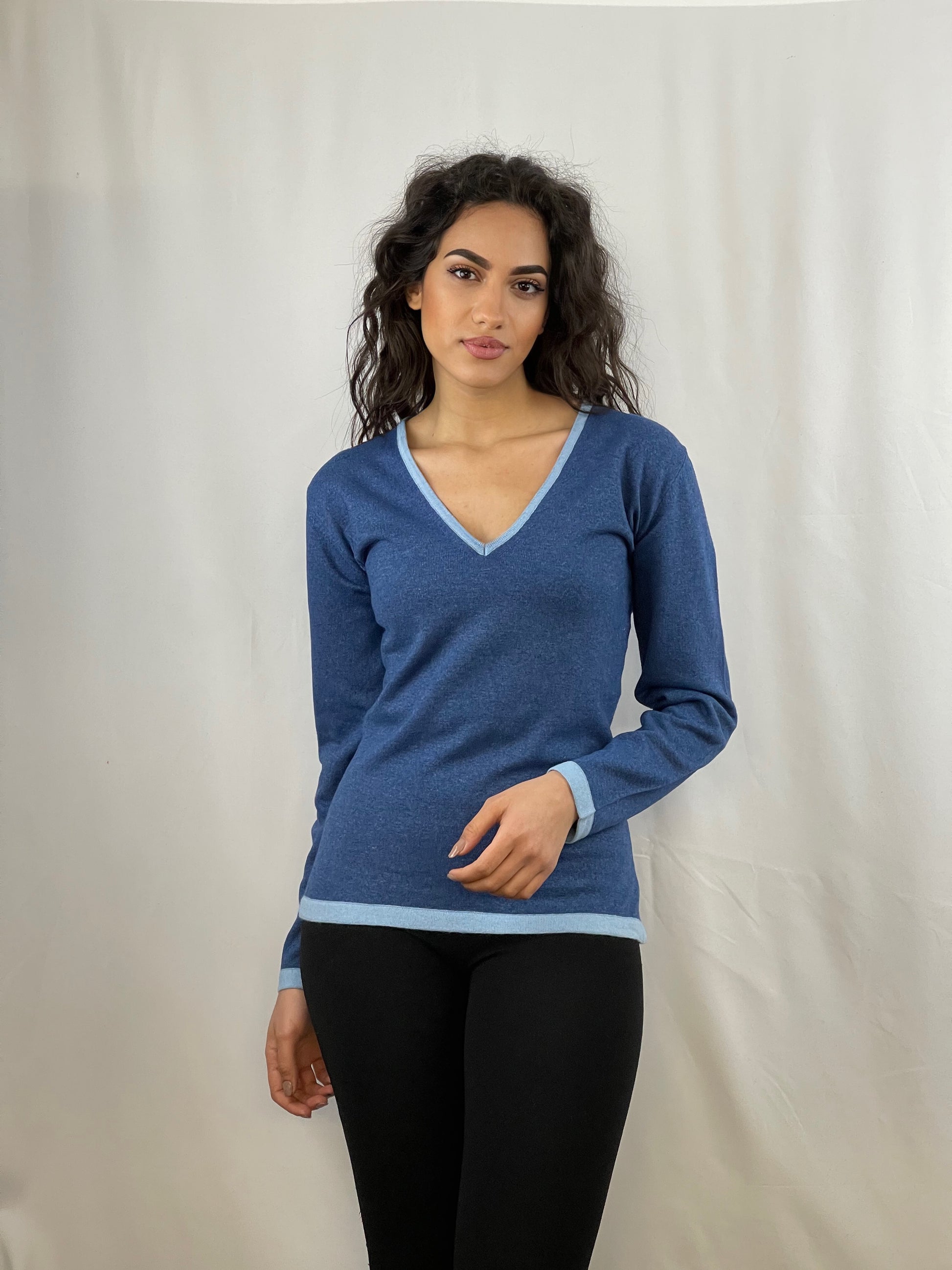 This women's V-neck sweater offers a stylish and fashionable look thanks to the eye-catching color combination on the collar, cuffs and hem. The slim fit gives a slim and feminine silhouette, perfect for any occasion. Crafted from high-quality materials, this sweater is a must-have for every wardrobe.