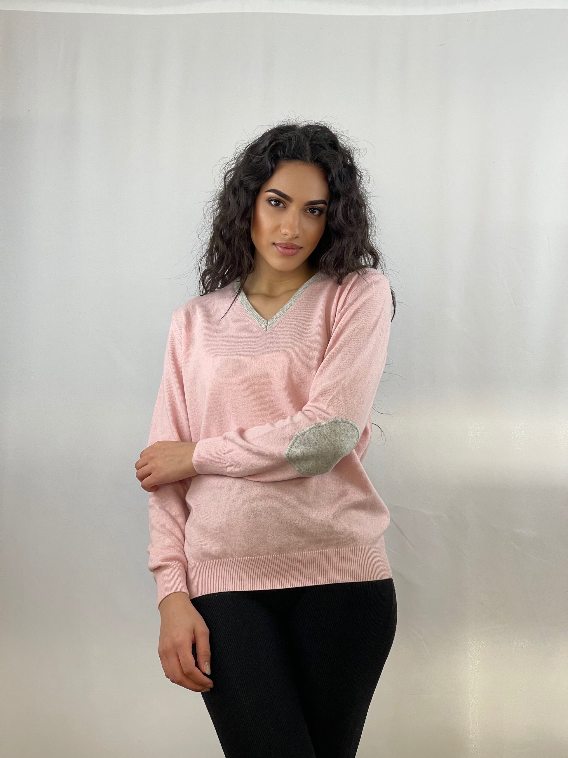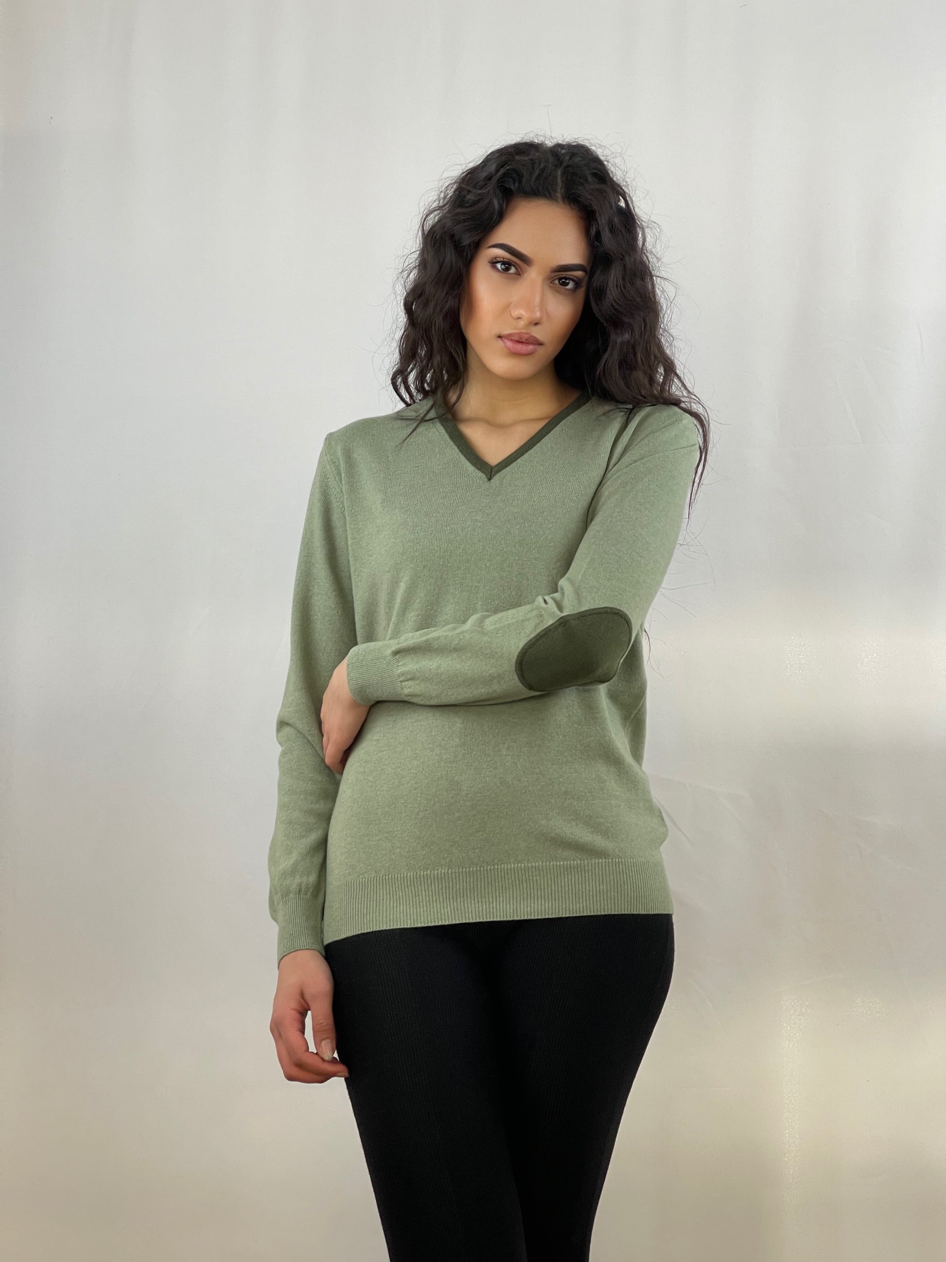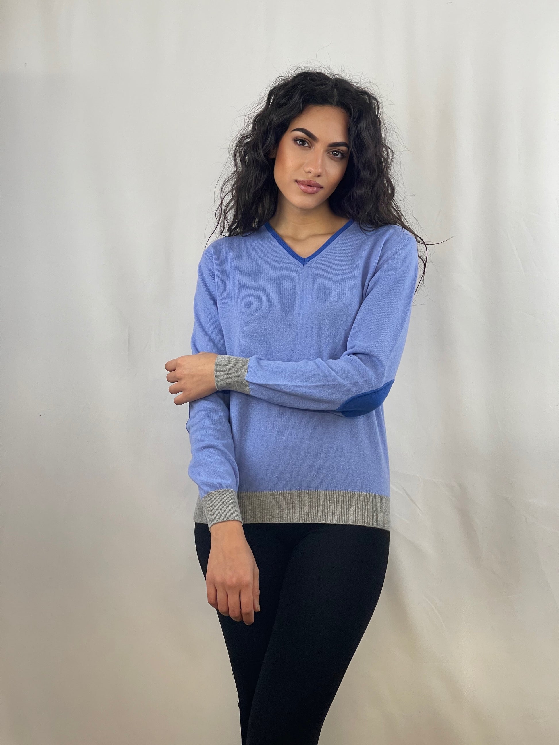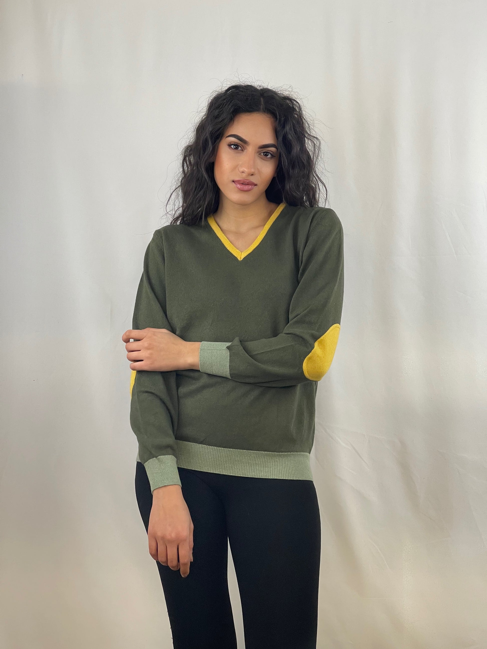 This V-neck sweater is perfect for fashionable women. Its long sleeves and contrasting trim add a touch of style to the look. The classic fit and colorful patches make this sweater a must-have for every wardrobe.