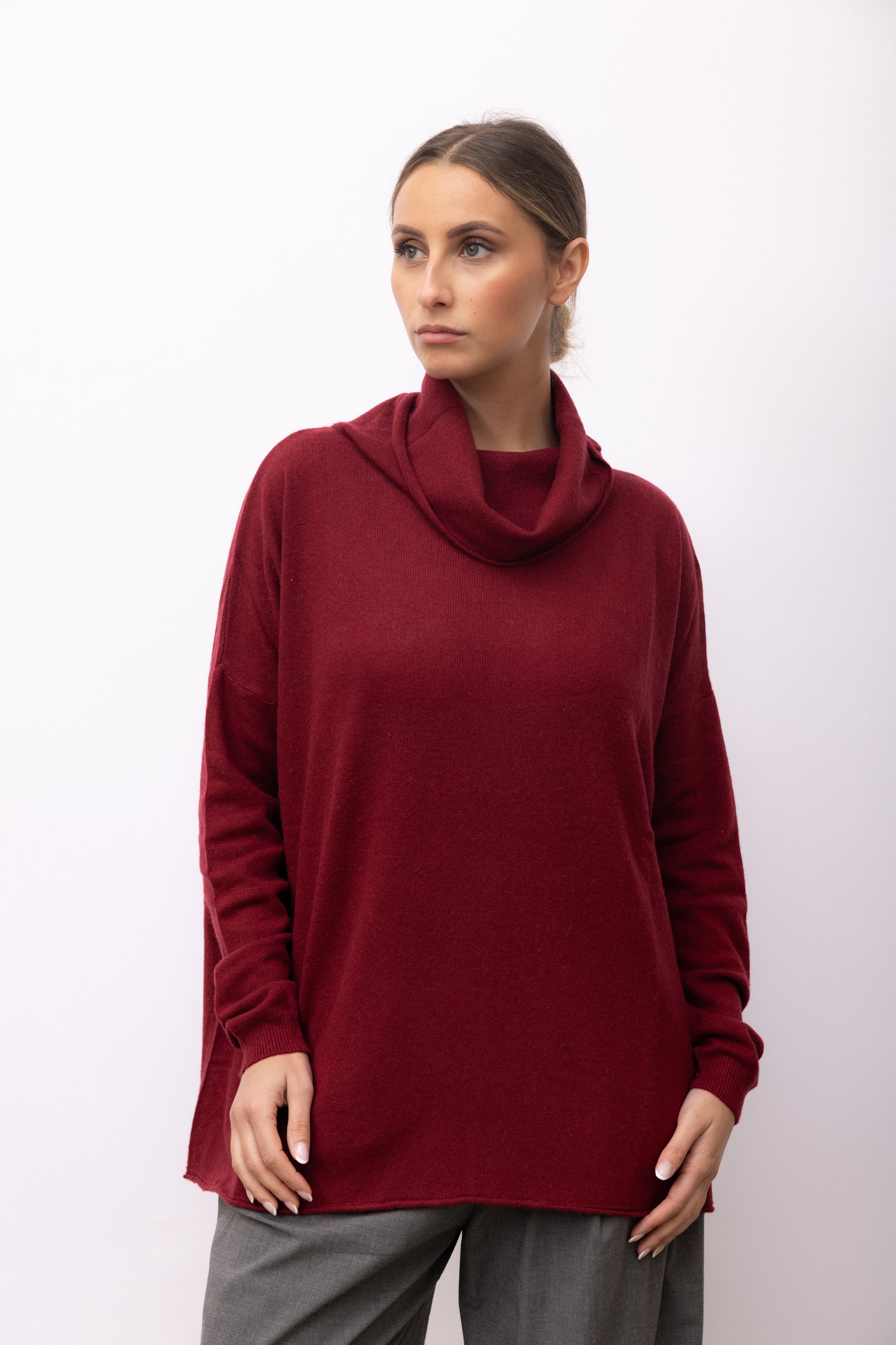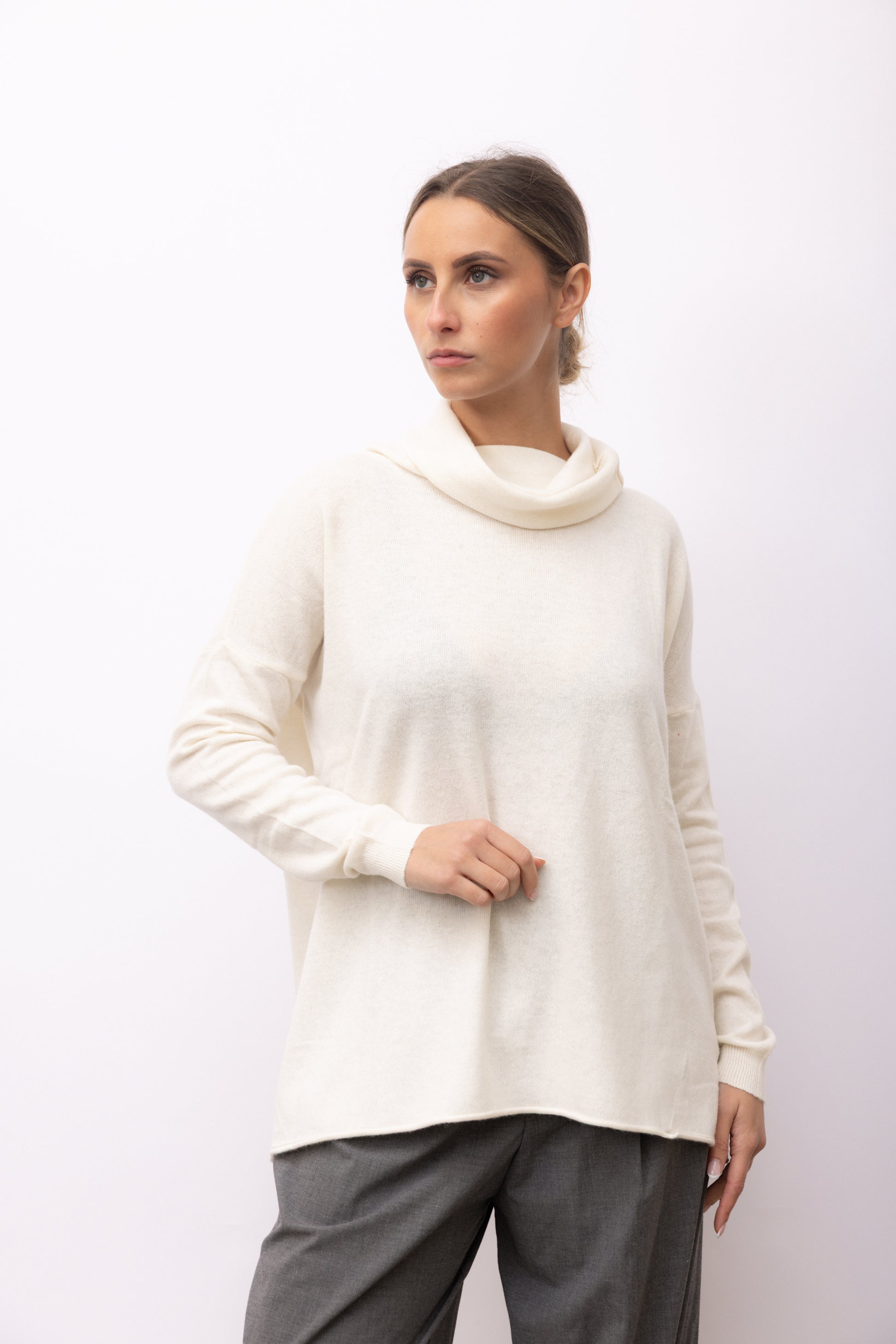 This cashmere sweater with a wide neck is perfect for colder days. The high-quality material ensures unparalleled comfort and softness, while the wide neck adds a touch of style. Stay warm and chic with our cashmere sweater!
